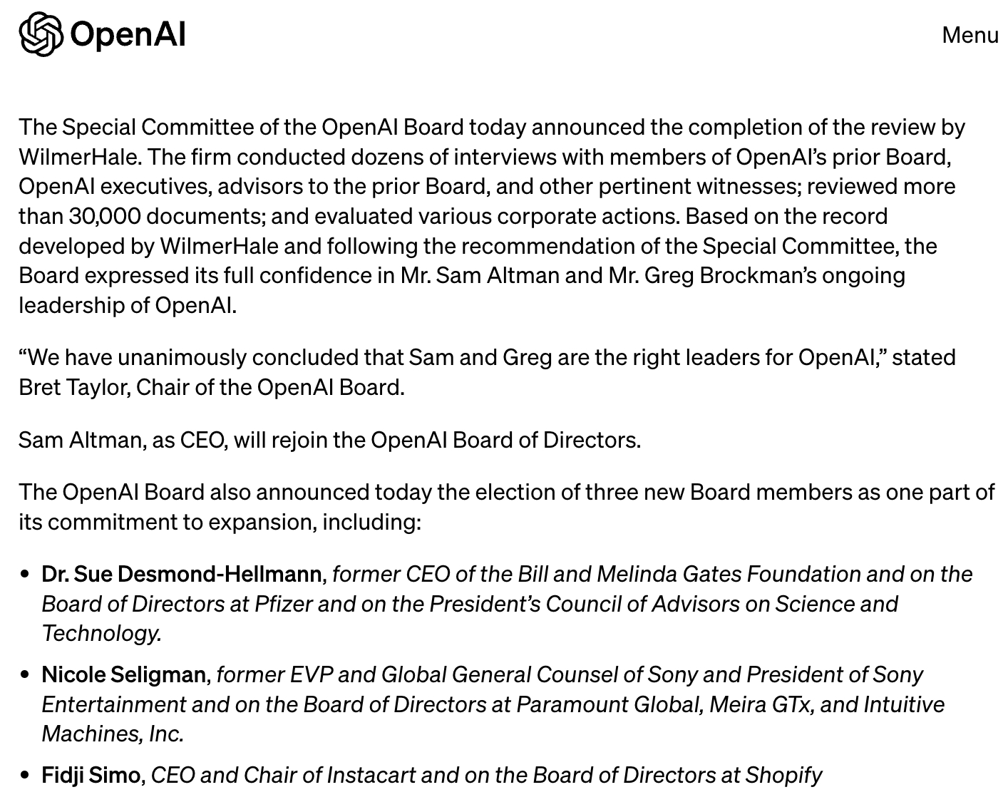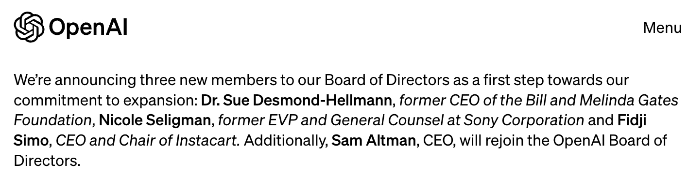 一度被原董事会“流放”的CEO Sam Altman,宣布正式回归董事会。随之而来的,是三名新董事会成员:比尔及梅琳达·盖茨基金会前CEO、辉瑞董事会成员Sue Desmond-Hellmann,索尼前执行副总裁兼全球总法律顾问Nicole Seligman,以及生鲜电商平台Instacart董事长兼CEO 、Shopify董事会成员Fidji Simo。