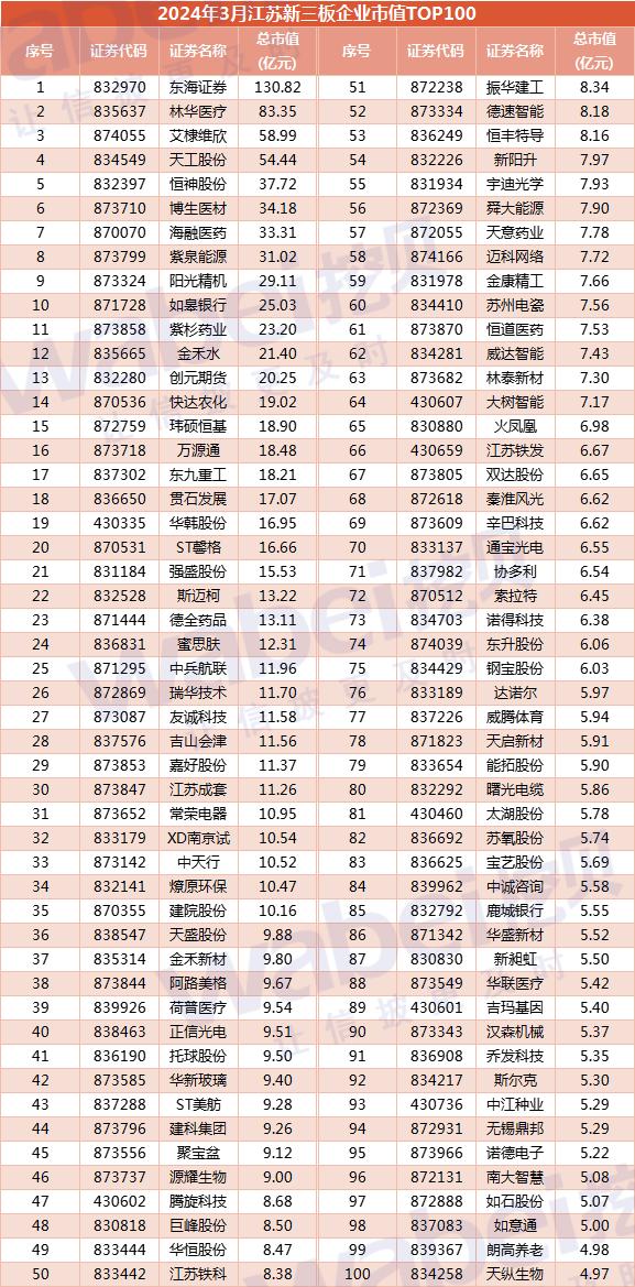 附-2024年3月江苏新三板企业市值TOP100(数据截至3月7日收盘)