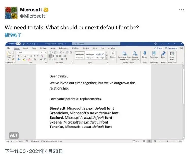Instagram 用户 Elle Cordova 还将 Calibri 被 Aptos「夺位」的故事写成了小喜剧,拟人化呈现出不同字体所代表的个性。