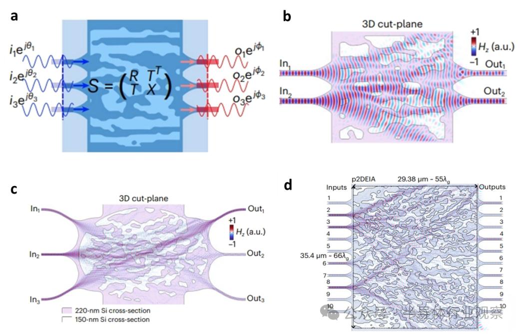 近日,美国宾夕法尼亚大学Vahid Nikkhah,Nader Engheta等学者提出了高效率仿真新方法,逆向设计了大矩阵维度的光学向量-矩阵乘法计算芯片。