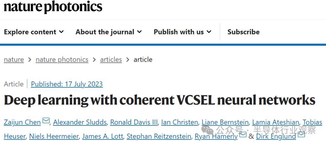 麻省理工学院(MIT)光学人工智能团队首次提出将“时间-空间复用”应用在计算的光芯片设计理念,并采用光电效应做乘法和加法运算。2023年7月,相关论文以《Deep learning with coherent VCSEL neural networks》为题发表在 Nature Photonics 上。