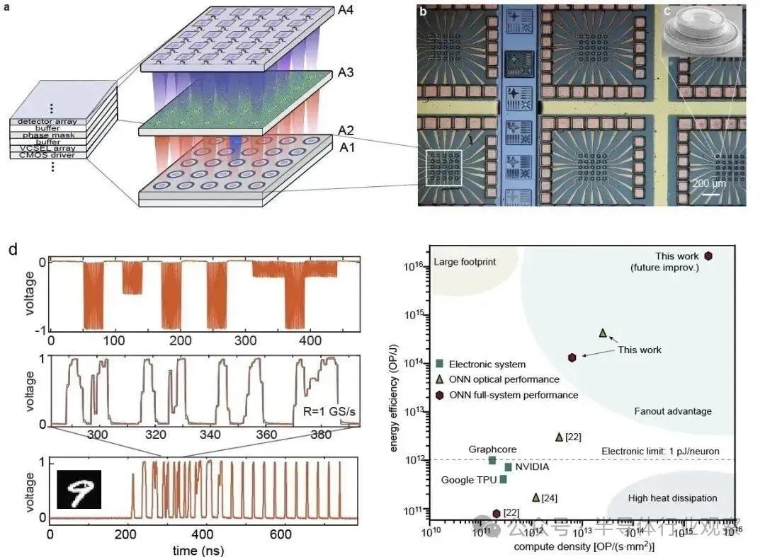 这个计算架构在垂直表面发射激光器(VCSEL)阵列实现,并进行实验验证,实现了整体性能突破。