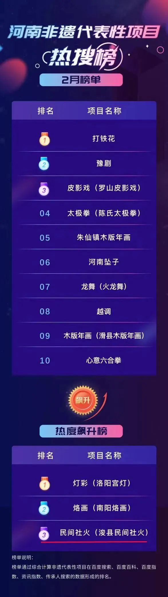河南文旅厅官微发布的2024年2月份“河南非遗代表性项目热搜榜”中,灯彩(洛阳宫灯)、烙画(南阳烙画)、民间社火(浚县民间社火)的热度持续飙升。舞龙表演、庙会市集、非遗秀场等活动成为游客新春出游的年俗类选择。