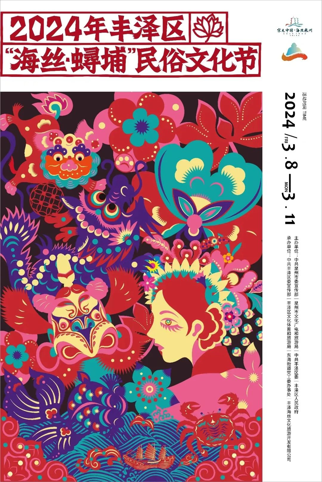 福建泉州的“海丝·蟳埔”民俗文化节于3月8日正式开启。据介绍,民俗文化节以“新城之貌·世遗底蕴”为基础,民俗文化与年轻时尚融合碰撞,通过最接地气最地道的民俗展示、最创新最时尚的非遗创新设计运用,积极探索文商旅融合,丰富民俗文化消费场景业态,建设文旅产业新城市。其中,由蟳埔社区群众自发组织的妈祖“天香巡境”活动还特别邀请台湾“电音三太子”、潮汕英歌舞等地方特色表演。到时,社区居民上至八十老妪、下至三岁幼童,戴上鲜花制成的簪花围,穿上定做的最美新衣,汇聚成一片流动的花海。