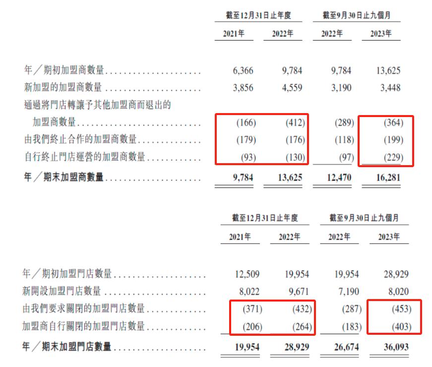 同时招股书中披露了另外一组数据,2021、2022和2023年前三季度蜜雪冰城加盟商门店的关店数量分别为577家、696家和856家,同一时期因转让和终止合作而退出的加盟商数量则分别为438家、718家和792家,几乎呈现1:1的规律也能看出大多数退出的加盟商都是只开了1~2家门店的“新手”。