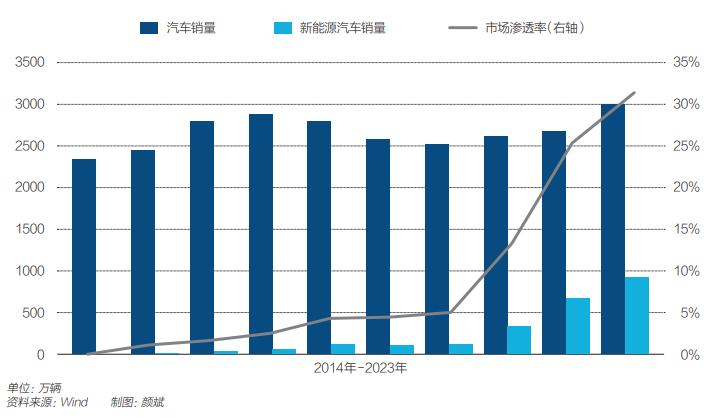 一方面,新能源汽车销量及市场渗透率不断提升,Wind数据显示,2014年,中国新能源汽车销量仅为2.2万辆,市场渗透率0.09%,但到了2023年,新能源汽车渗透率达31.5%,在10年的时间里得到显著大幅提升。