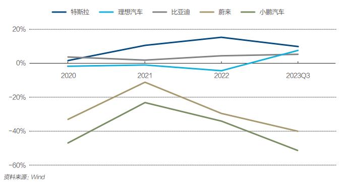 至于理想汽车,也是从2023年开始,销售净利率开始回正。而比亚迪虽然比值始终为正,但截至2023年Q3还只是勉强超过5%。