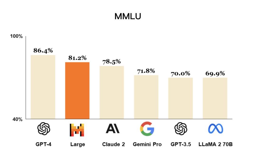 除了真金白银的训练成本,后来者居上的Mistral Large的时间成本也更具优势。OpenAI从成立到推出GPT-4,足足用了8年,而Mistral AI推出仅次于GPT-4的Mistral Large只用了9个月。