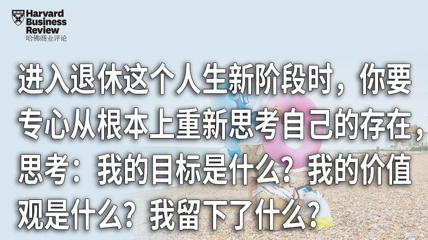 进入退休这个人生新阶段时,你要专心从根本上重新思考自己的存在,思考这些问题:我的目标是什么?我的价值观是什么?我留下了什么?我与生俱来的优势和劣势是什么?让我快乐的是什么?现在我希望在人生中实现怎样的目标?