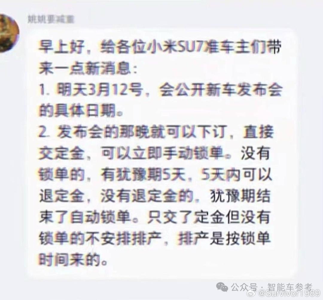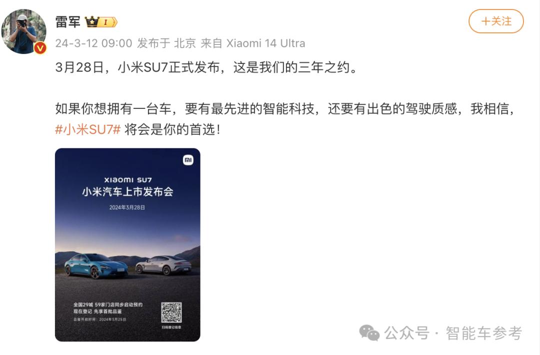 官宣定档消息有2个值得关注的点,第一是小米承诺上市即交付,交付即上量。同时雷军预告了3月25号开启面向公众的试驾品鉴活动。