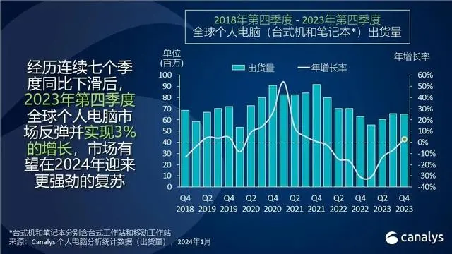 根据机构IDC的预测,PC市场收缩已触底,预计在2024年实现增长。据Canalys最新的数据,2023年Q4全球PC出货量同比增长3%,终止了此前的七连跌。