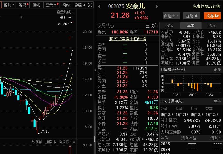 “截至3月6日收盘,近7个交易日,安奈儿连收7个涨停板,股价也突破20元大关,逼近了去年因抗病毒面料炒作的高点……”当日盘后,“证券之星”便以《三问安奈儿跨界算力》为题,对其跨界算力布局中是否存在“蹭概念为减持”、“连续多年亏损”、“十倍溢价收购”发问。