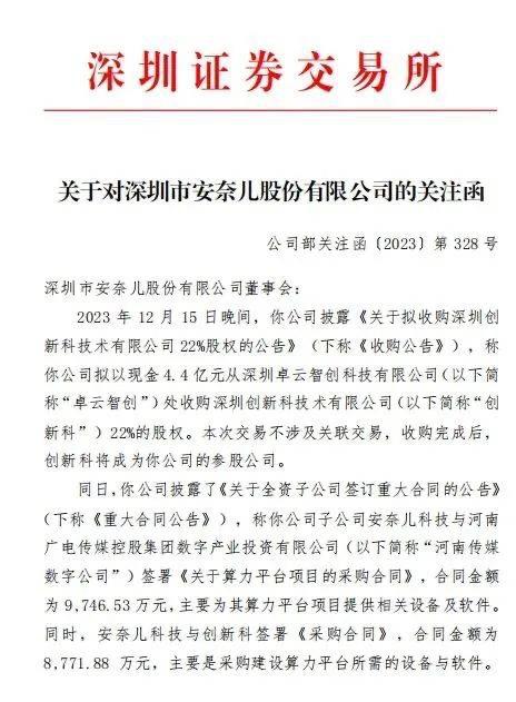 作为一家主营童装的服装企业,事实上,安奈儿从2023年12月15日盘后发布公告、开始跨界算力的那一刻开始,就持续引发各方质疑。其中,在公告发布的次日,深交所便紧急下发关注函。