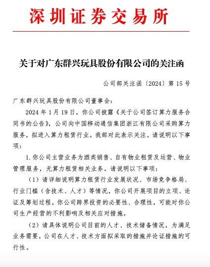 深交所要求群兴玩具说明开展项目的立项、论证及筹划过程,以及跨界投资的必要性、合理性,可能对公司生产经营的不利影响及相关应对措施。并要求群兴玩具说明还需在人才、技术、设备、营销等方面的具体投入情况,结合公司的货币资金、财务状况、融资能力、融资安排、预计投资进度等,说明开展算力租赁业务是否具有可行性,是否已具备明确的资金来源。深交所还特别要求群兴玩具核查公司及相关方是否存在利用本次交易事项炒作股价、违规买卖公司股票,以及是否存在蹭“算力租赁”热点概念的情形。