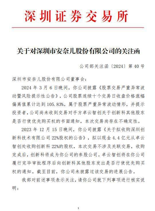 就在今年3月6日,安奈儿股价连续7日涨停之际,该公司披露了股票交易严重异常波动暨风险提示性公告。当晚,安奈儿再次收到深交所的关注函。