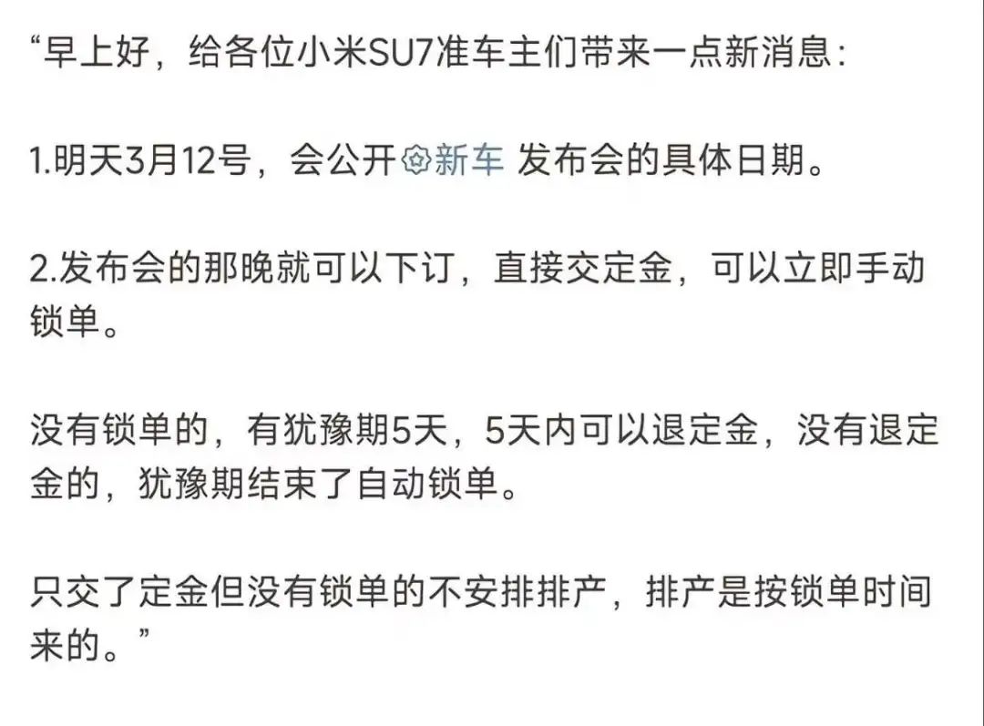 称明天(3月12日),小米就会公开汽车发布会的具体日期;另外,发布会的当晚就可以下订, 直接交定金可以立即锁单,没有锁单的,会有5天的犹豫期,5天内可以退定金,犹豫期结束后会自动锁单,只交了定金但没有锁单的不会安排排产,排产是按锁单的顺序来的。