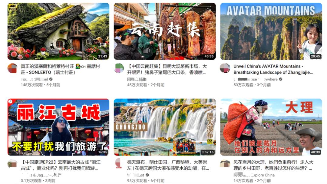 同时,越来越多类型的目的地正在被外国游客所认识。在中国YouTube点击旅游景点显示结果中,可以看到拉萨、大理、昆明、重庆、苏州等熟悉的城市,也有像贵州千户苗寨、上饶望山谷、大凉山悬崖村、成都宽窄巷子、福建土楼、阳朔遇龙河、德天瀑布等极具中国特色的景点、村庄正在被认识。