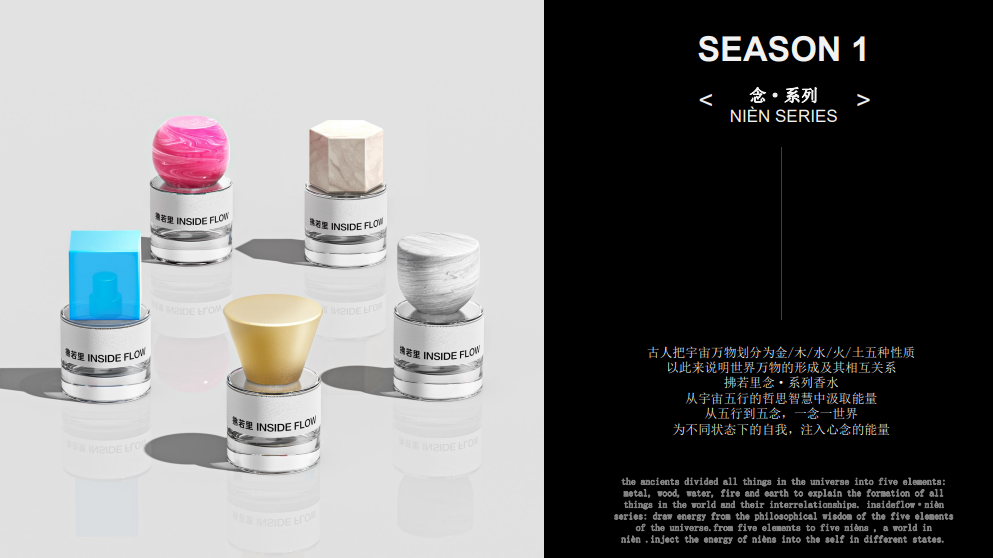 首发“念·系列”香水,提取自古人“金木水火土”的五行智慧,化“五行”为“五念”,为不同状态下的自我,注入心念的力量。如“炽念”花果香调香水,代表着火一般的行动力,永不停止的好奇与探索,永不消失的希望与热情,永不退缩的面对与坚持,勇敢的人,先享受世界。“蛮念”木质调香水,代表着树木一样的生命力,要野蛮生长,争夺阳光,无限接近天空,也要向下扎根,经受住风雨,不迷失于好天气,长期主义,生生不息。另外还有代表专注力的“执念”,代表松弛感的“转念”,代表安定感的“空念”。