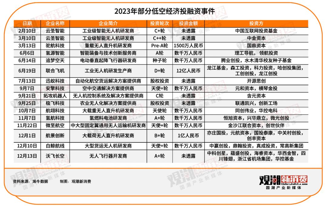 在资本市场,低空经济同样火热。 根据汇总,2023年低空经济领域共发生十余起投融资事件,金额最高超10亿元。 在资本助推下,众多新企业、新品牌布局低空经济,推动行业持续发展。
