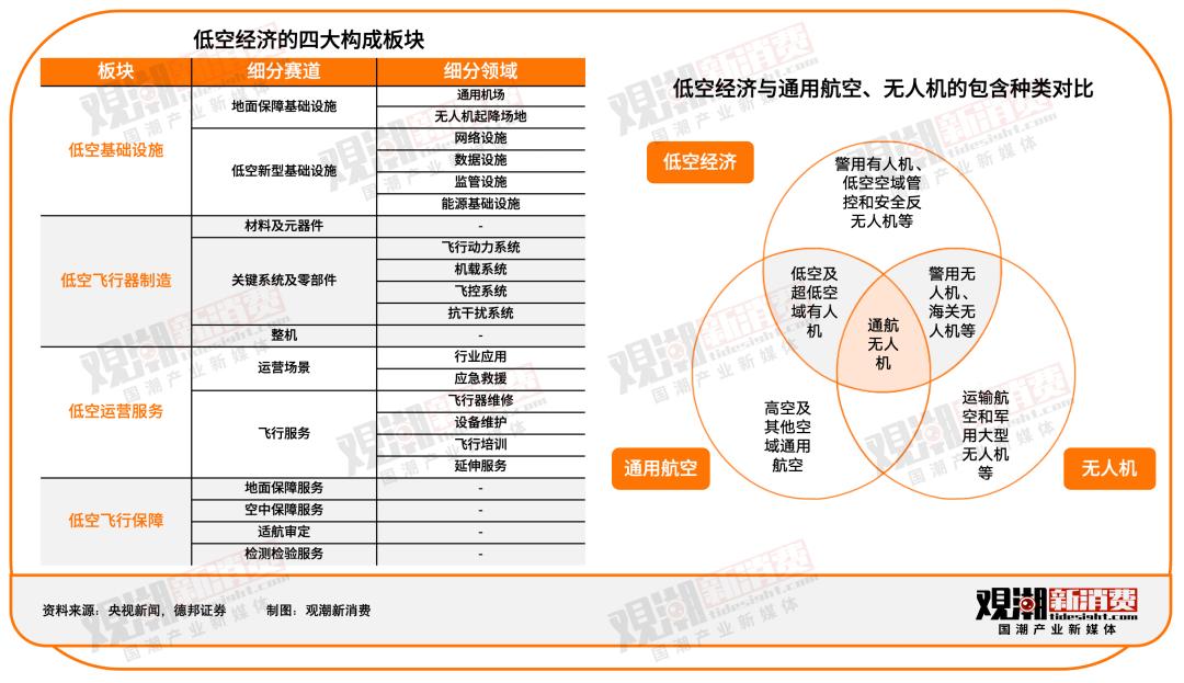 低空经济由基础设施、飞行器制造、运营服务和飞行保障四大板块构成,相比通用航空和无人机,有共同之处,但包含更广。