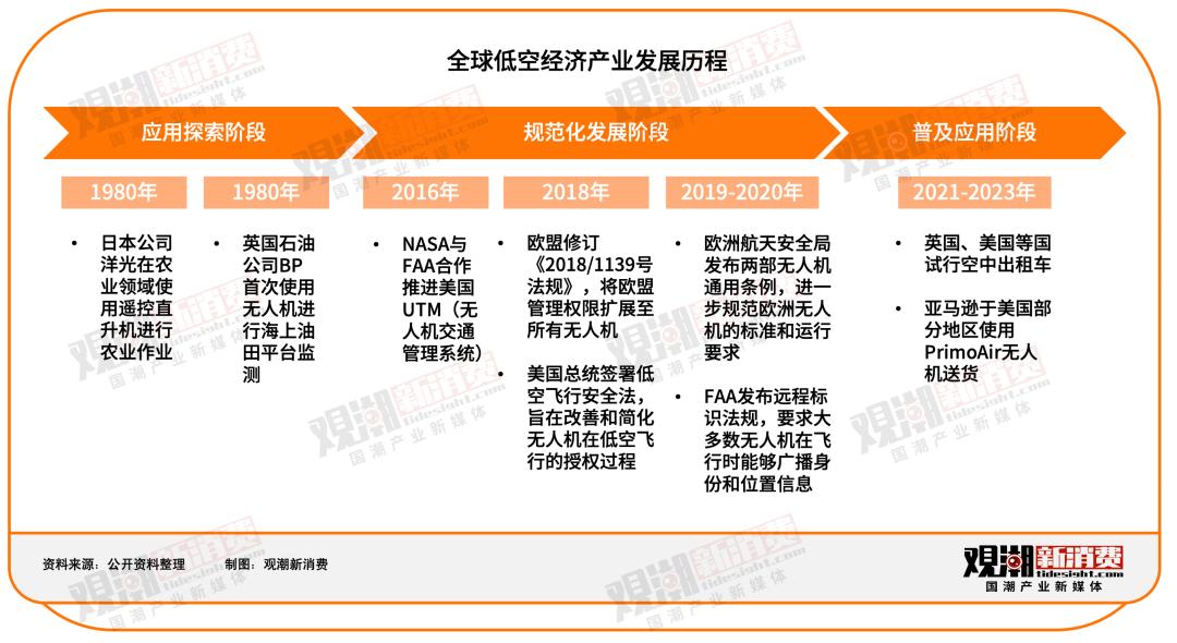 全球低空经济发展至今先后经历了早期应用探索阶段和规范化发展阶段。其中在早期,由于低空技术不成熟,该产业发展主要以低空旅游和在农业、工业的探索应用为主。2010年以后,随着低空飞行技术的愈发成熟和应用的多元化,规范化监管成为这一时期各国低空经济发展的主要任务。 当下全球低空经济正处于进一步的应用普及阶段。
