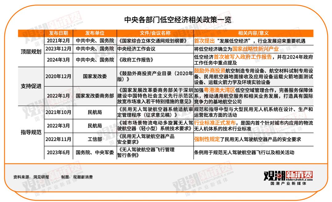 自2021年2月中共中央、国务院在《国家综合立体交通网规划纲要》中首次提出“发展低空经济”以来,相关产业政策密集出台。从顶层规划来看,低空经济被确立为国家战略性新兴产业,并且在2024年政府工作任务中被重点提及,未来发展目标明确。 各类支持与规范性文件也陆续出台,发展路径逐步明晰。