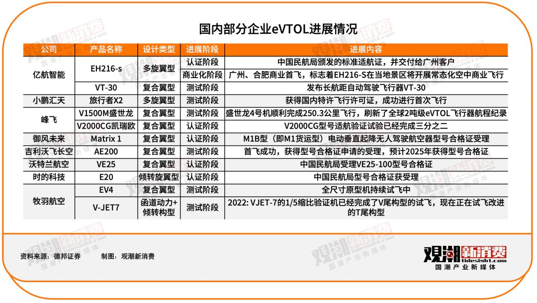 目前我国众多企业已加入对eVTOL的布局,其中亿航智能的EH216-S是目前全球唯一取得TC(型号合格证)的eVTOL航空器。沃飞长空、时的科技、沃兰特等企业也在积极布局,申请受理。