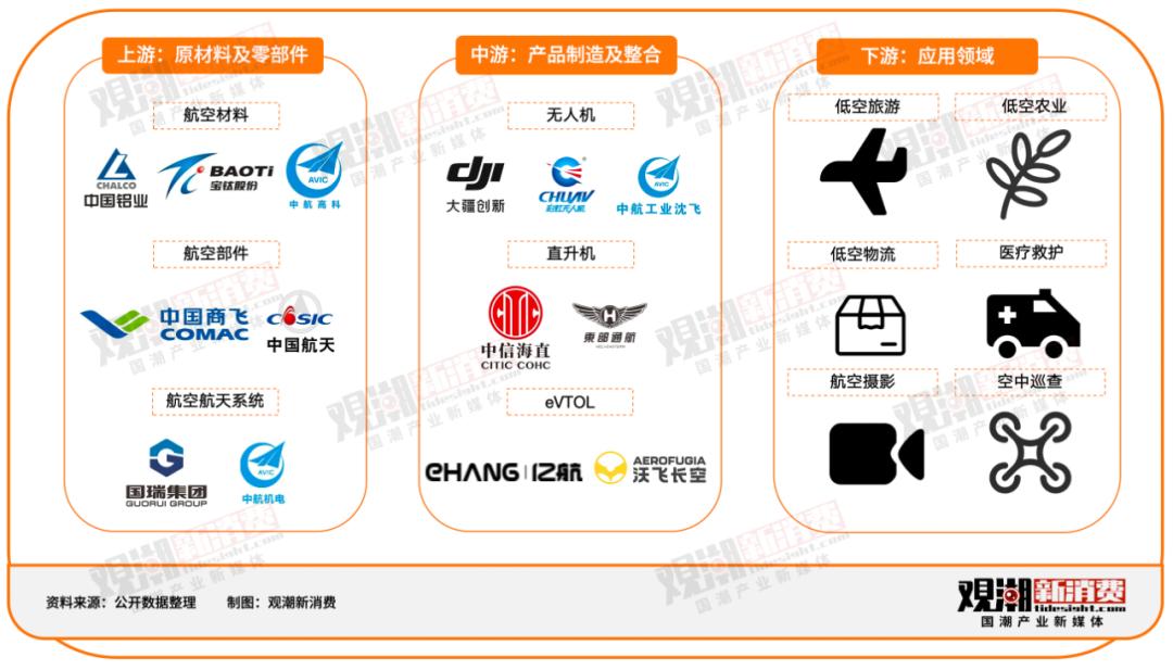 低空经济产业链上游为原材料及零部件,可分为航空材料、航空部件及航空航天系统,主要代表企业有中国铝业、宝钛股份、中国商飞等;中游为产品制造及整合,包括无人机、直升机及eVTOL,代表企业有大疆创新、中信海直、亿航智能、沃飞长空等;下游应用领域则包括低空旅游、低空农业、低空物流、医疗救护、航空摄影、空中巡查等。