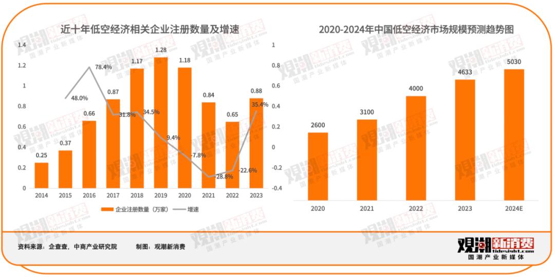 从企业注册数量来看,2020年至2022年,我国低空经济相关企业注册量分别达1.18万家、0.84万家、0.65万家;2023年,我国低空经济相关企业注册量达0.88万家,同比增长35.4%。根据中商产业研究院数据,2022年低空经济对国民经济的综合贡献值约为4000亿元,同比增长29.03%。中商产业研究院预测,2023年市场规模将达4633亿元,2024年将达5030亿元。