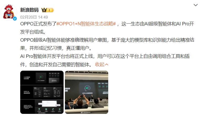 2月20日,在AI战略发布会上,OPPO提出了“1+N智能体生态战略”,其中“1”是OPPO的AI能力的智能体,而“N”则代表着基于OPPO AI Pro智能体开发平台所赋能的生态,用户可借助零代码的自然语言交互,快速生成专属个人的个性化AI智能体。