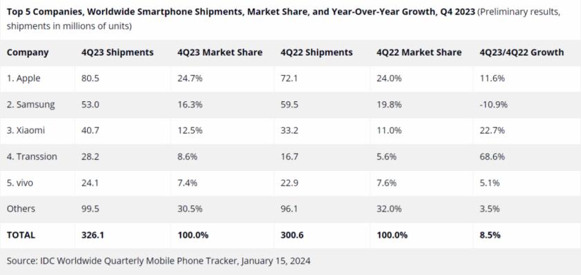 2023年前三季度,OPPO的市场份额分别为10.2%、9.6%、8.9%;到第四季度,OPPO再次跌出全球前五,曾被国内厂商轻视的“非洲手机之王”传音手机已经跻身TOP5行列。而魅族,早就沦为国内市场“others”许多年了。