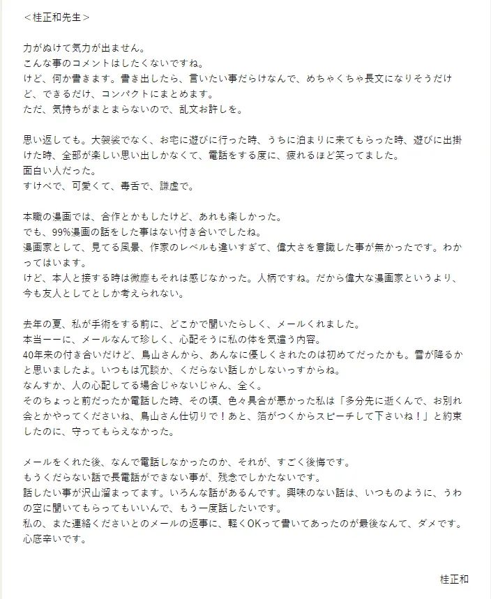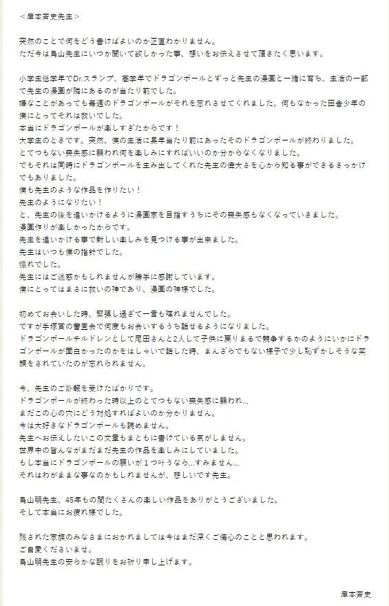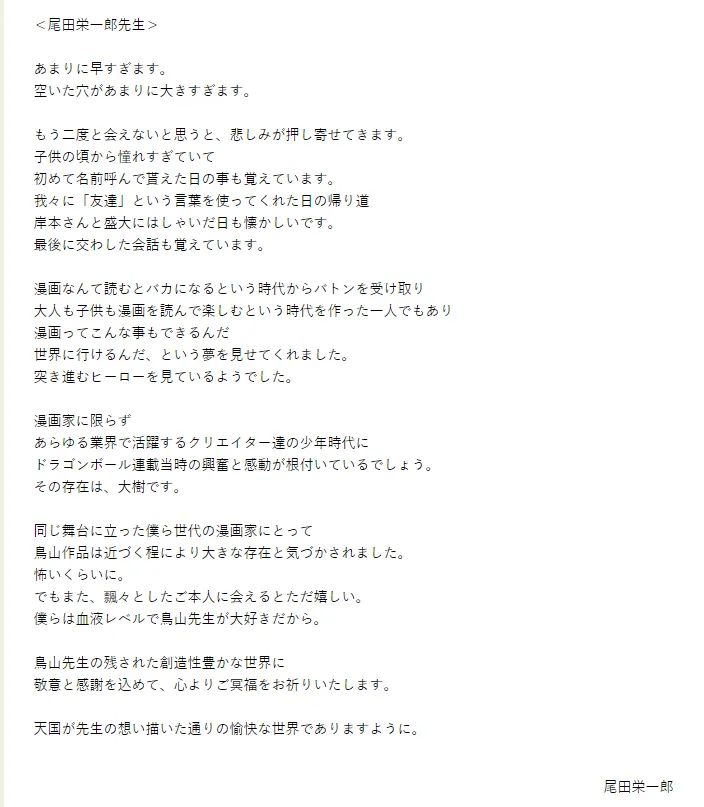 随后,日本动漫界人士大多以发文方式悼念鸟山明的离去。