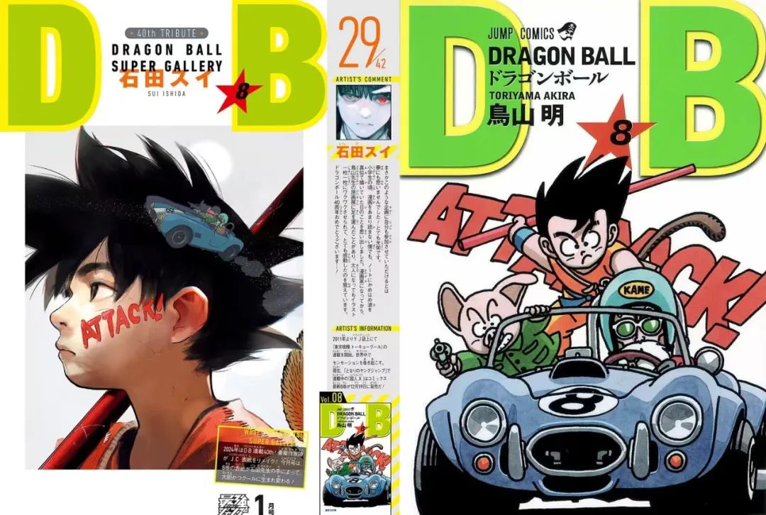 而今年恰好是《龙珠》第四十周年,在2023年的时候,集英社JUMP杂志启动了一个新的系列,即“龙珠超级画廊”系列,旨在2024年之前,让众多知名的漫画家在最初《龙珠》42卷连载漫画封面的基础上挑一幅进行重新绘制。目前这个活动还未结束。可惜的是,鸟山明已经离开了,他再也看不到剩余的重制封面会是什么样。