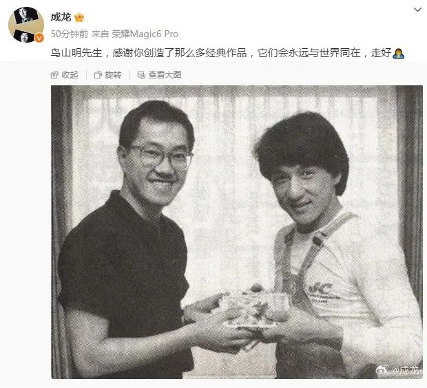 成龙也在微博上表示:“鸟山明先生,感谢你创造了那么多经典作品,它们会永远与世界同在,走好。”