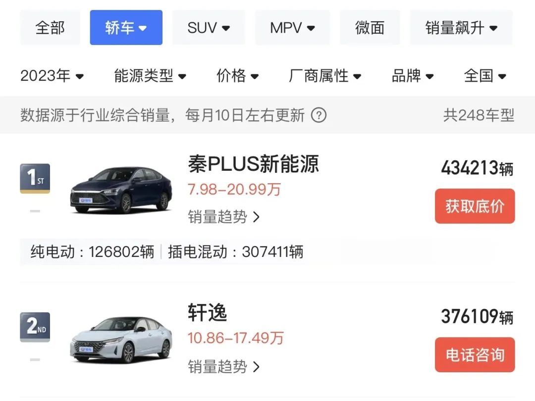 2023年轩逸卫冕了燃油车销冠,但在包含新能源车型的轿车销量总榜上,轩逸被“9.98万起售”的2023款比亚迪秦PLUS冠军版反超。秦PLUS车系交出了约30.7万辆的DM-i插混车型,外加12.6万辆的EV纯电动车型,总计约43.4万辆,将年销37.6万辆的轩逸踹下王座。