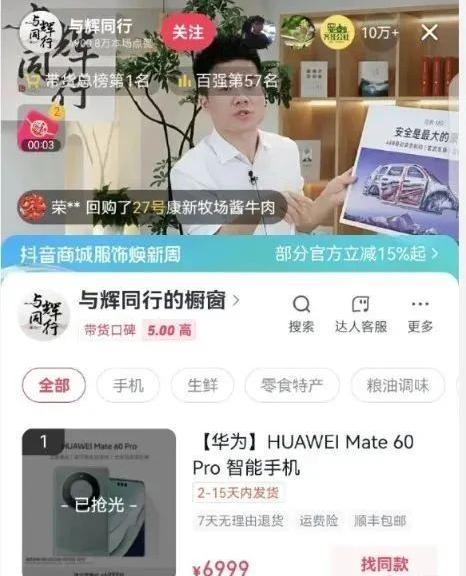 据第三方数据,在2月28日-3月8日抖音38大促期间,“与辉同行”直播间累计观看人数达到9063万,累计直播销售额超过1亿元。同一时间周期内,东方甄选的累计直播销售额同样超过1亿元,但累计观看人数为6123万,两者之间存在一定差距。3月10日晚,董宇辉亮相“与辉同行”直播间,对华为多款产品进行带货。全场销售额超过1亿元。