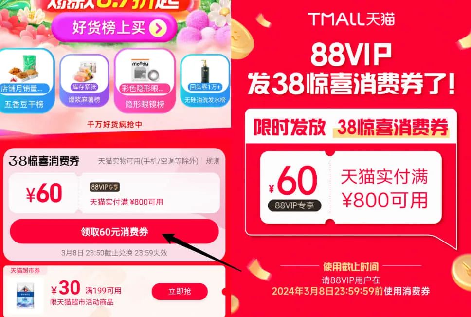 比如淘宝是跨店满减每300-40,相当于87折,并且在会随机掉落实付800-60的88VIP专享消费券,用户领取后即可直接领取。另一种则是指定商品的优惠券,具体优惠金额、有哪些商品适用等信息都会在商品详情页明确标注,这也是多个平台都有的“基础”优惠。