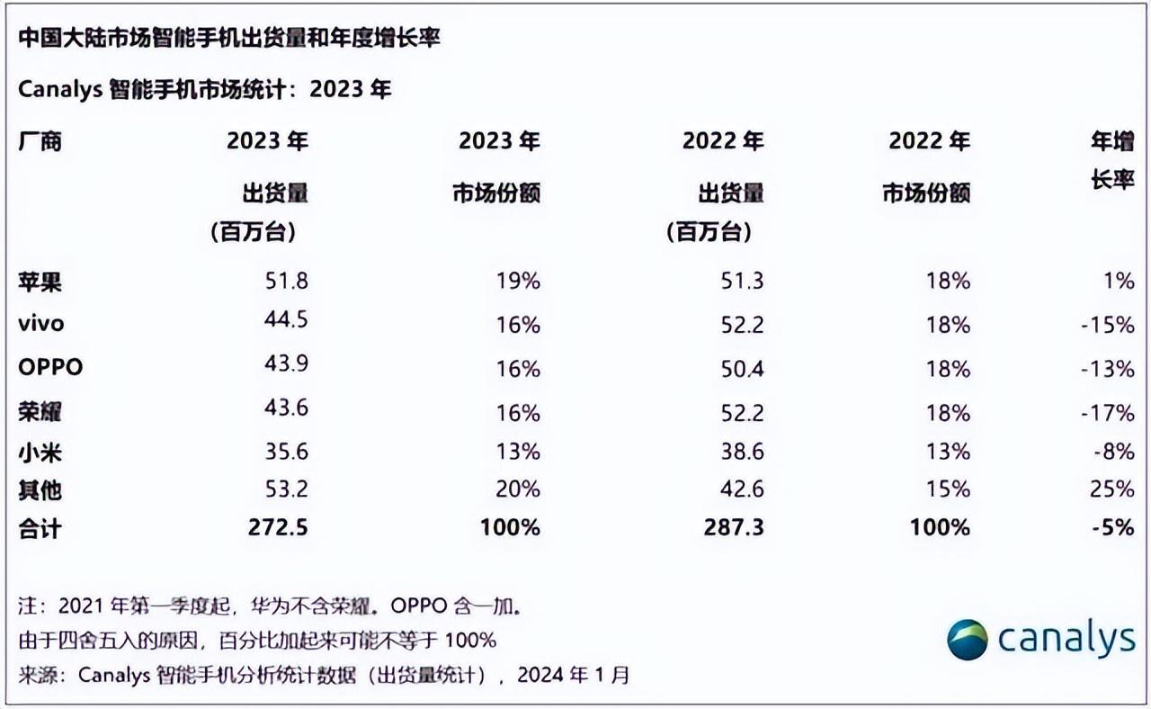 2023年全年,根据Canalys数据显示,苹果首次夺得中国大陆市场全年出货第一位置,同比出货微增1%,全年市场份额进一步提升至19%。vivo,OPPO和荣耀势均力敌,企稳在16%的市场份额,全年分别出货4450万台、4390万台、4360万台。小米以13%维持在全年市场第五。