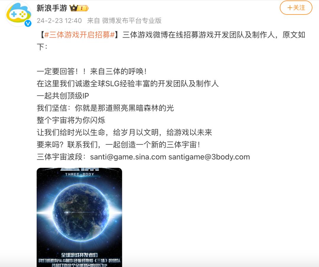 2月23号,新浪游戏官方微博发布了一则招聘消息,宣布要为科幻IP《三体》招募SLG开发团队和制作人。2021年,新浪就拿到了《三体》IP的归属。