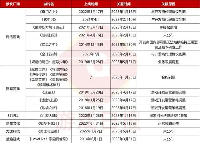 据游戏日报统计,2023年Q1季度国内超过21款游戏关服停运,其中近半为IP游戏。即使抛开网易与暴雪“离婚事件”影响的《魔兽世界》《暗黑破坏神》等,37游戏《斗罗大陆》腾讯《妖精的尾巴:魔导少年》都是国内外头部IP授权。