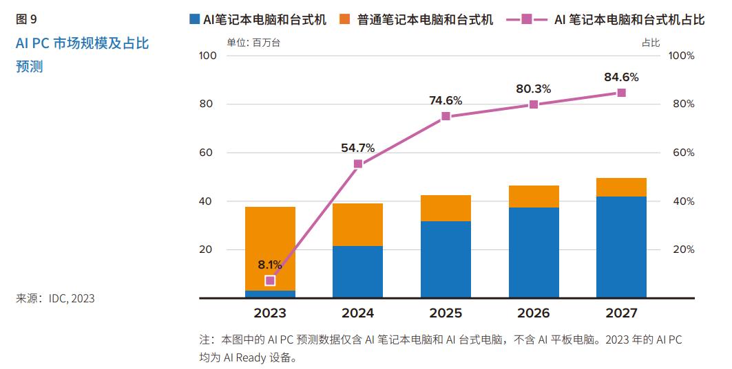 以中国PC市场为界,根据IDC数据显示,处理器集成AI加速引擎的AIPC(包括笔记本电脑和台式机)在2024年便成为市场主流。2027年,AIPC的市场份额预计将达到85%,基本完成对PC市场的渗透。预期的销量解释了,PC厂商为何纷纷将2024年作为推出AIPC产品的重要时刻。