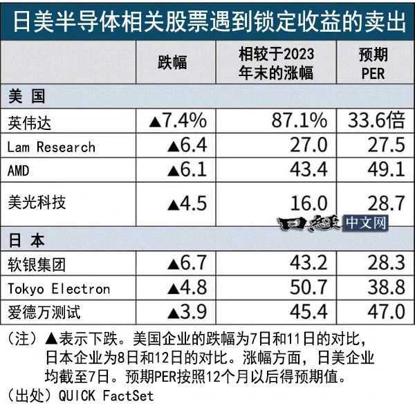 目前并未发现引发卖出的直接因素,市场普遍认为是锁定收益的卖出推动下跌。由于英伟达股价比2023年底上涨近9成,因此为卖出创造了有利环境。卖出动向也波及到了其他半导体股票,超威半导体(AMD)11日比上周末下跌4.3%。由主要半导体相关股票组成的费城半导体指数(SOX)在11日比上周末下跌了1.4%。