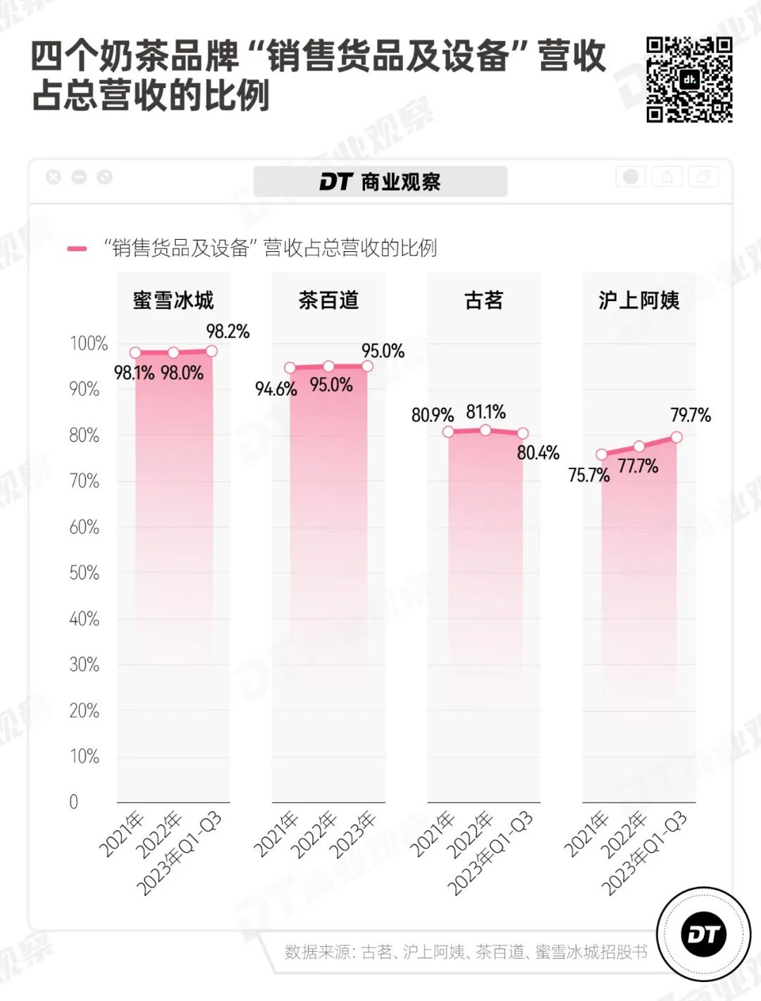 根据招股书数据,蜜雪冰城“销售货品及设备”的收入占比接近99%,茶百道紧随其后,2023年“销售货品及设备”营收占比95%,古茗和沪上阿姨都在8成左右。