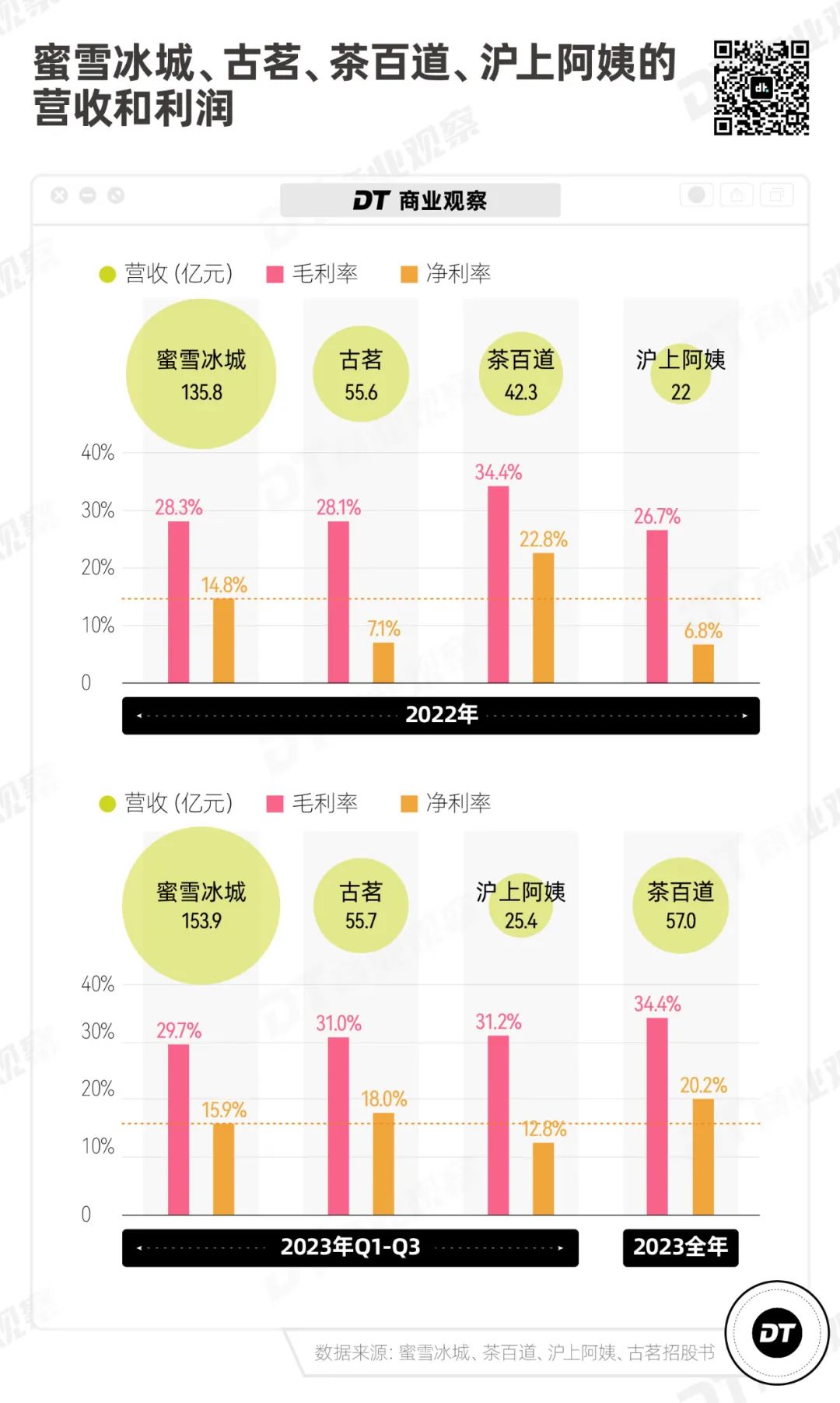 《DT商业观察》对比了四家奶茶品牌的营收和利润率,发现——古茗和茶百道的净利润率都超过了“师傅”蜜雪冰城。