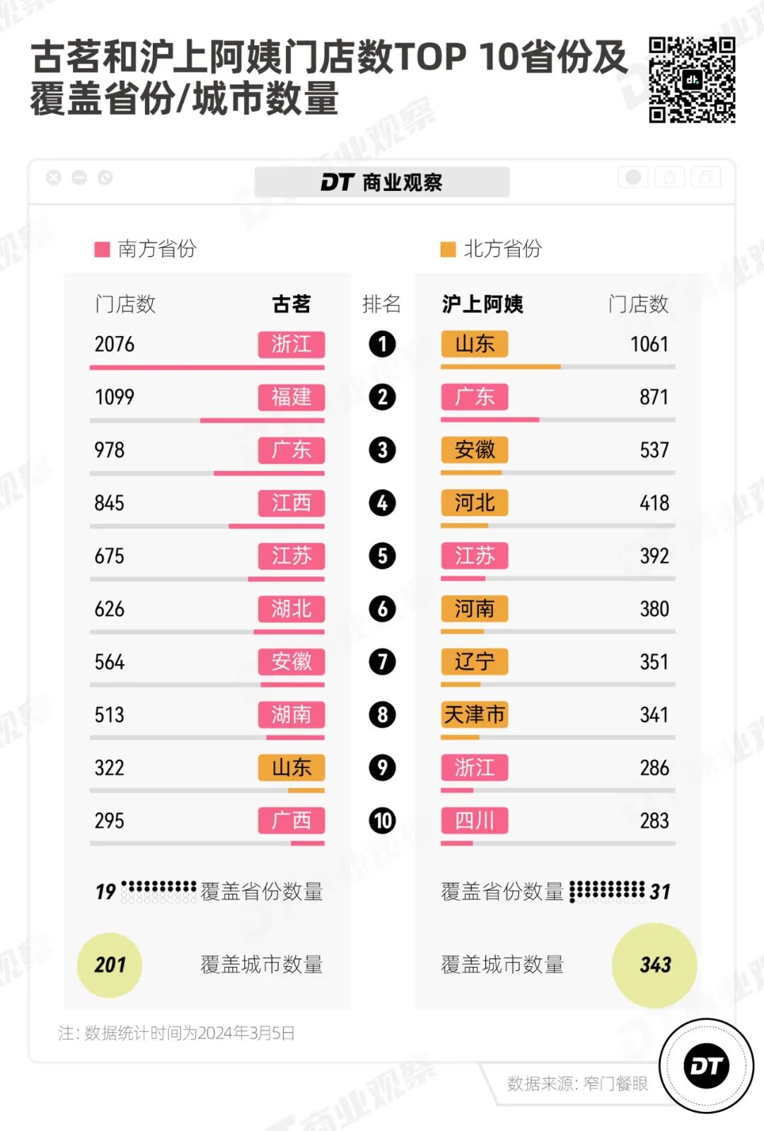 沪上阿姨盘踞北方,覆盖的省份和城市数量更多,也更分散;古茗如前文所说,以浙江为大本营,覆盖的省份和城市数量更少,但更集中。