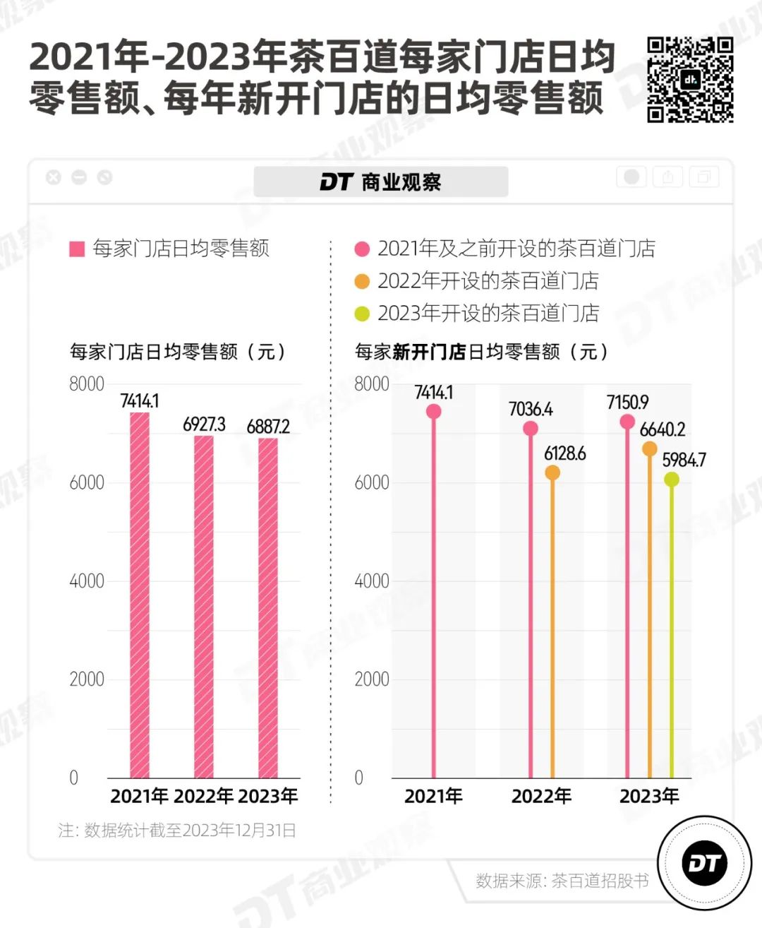 茶百道整体的赚钱能力最强,但2023年,它的单店零售额下降。