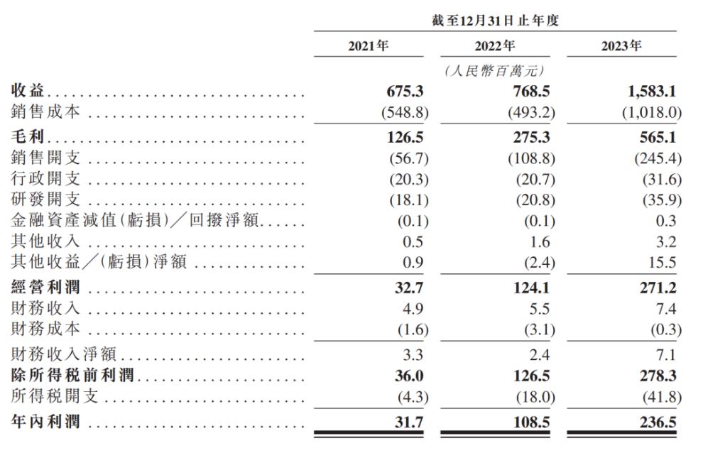 招股书显示,2021年到2023年,卡罗特营业收入分别为6.75亿元、7.69亿元及15.83亿元;毛利分别约为人民币1.27亿元、2.75亿元、5.65亿元;同期净利润分别为0.32亿元、1.09亿元及2.37亿元,年复合增长率为173.14%,净利润率分别约为4.7%、14.2%和15%。