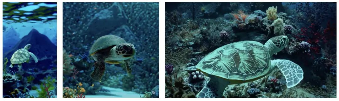 我们发布的 Sora 技术报告中有一个示例,展示了两个输入视频如何融合,左边的视频是无人机穿过斗兽场,右边的视频是蝴蝶在水下的珊瑚礁游泳,而融合的视频是,其中的一个过渡时刻,斗兽场开始腐烂,部分埋入水下被珊瑚礁覆盖,无人机变成了蝴蝶。