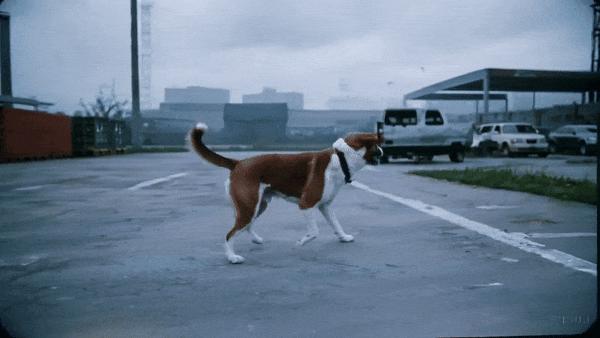 Sora 提示词:一只中等体型、看起来很友好的狗走过工业停车场。环境多雾、多云。采用 35mm 胶片拍摄,色彩鲜艳.