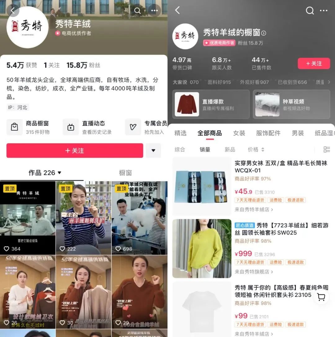 2021年,崔应国的红太羊绒在抖音电商开设旗舰店,作为整个行业养羊最多的企业,把“在陕北养殖50万只超细绒山羊”这一傲人数字写进了店铺简介里。通过打造多账号内容矩阵,积极寻找头部达人大V推广宣传,红太羊绒的影响力跨越了线下店铺的覆盖局限,累计吸引粉丝超过35万,直播间观看人数直线上涨,年销售额达到了5000万以上。随着今年销售旺季即将到来,红太更是将目标销售额调高到了1亿元以上,可以说是“吃”到抖音产业带扶持红利的商家。